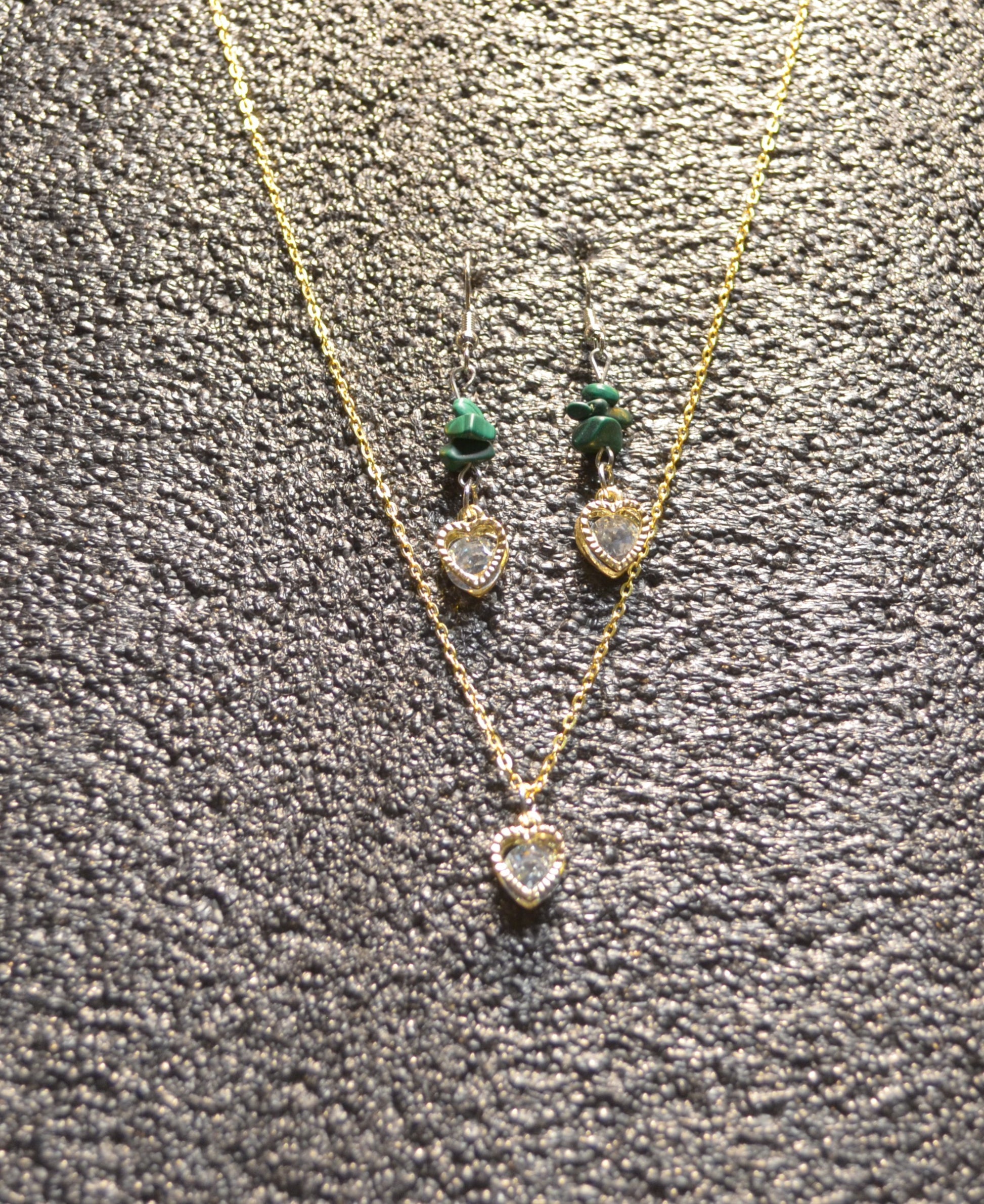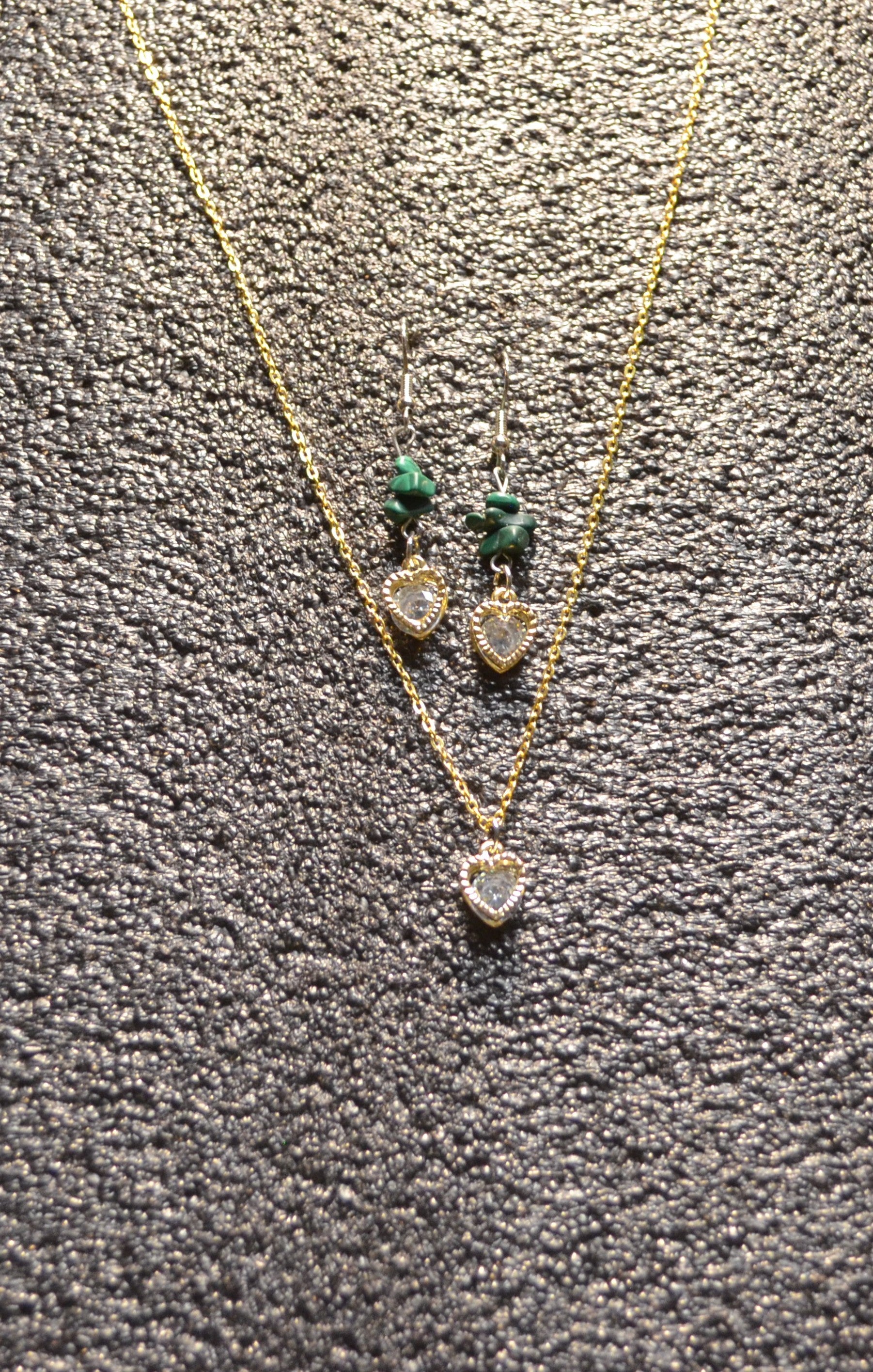GREEN GEM ZIRCONIA HEART EAR RINGS / CROSS GOLD CHAIN NECKLACE WITH ZIRCONIA HEART PENDANT